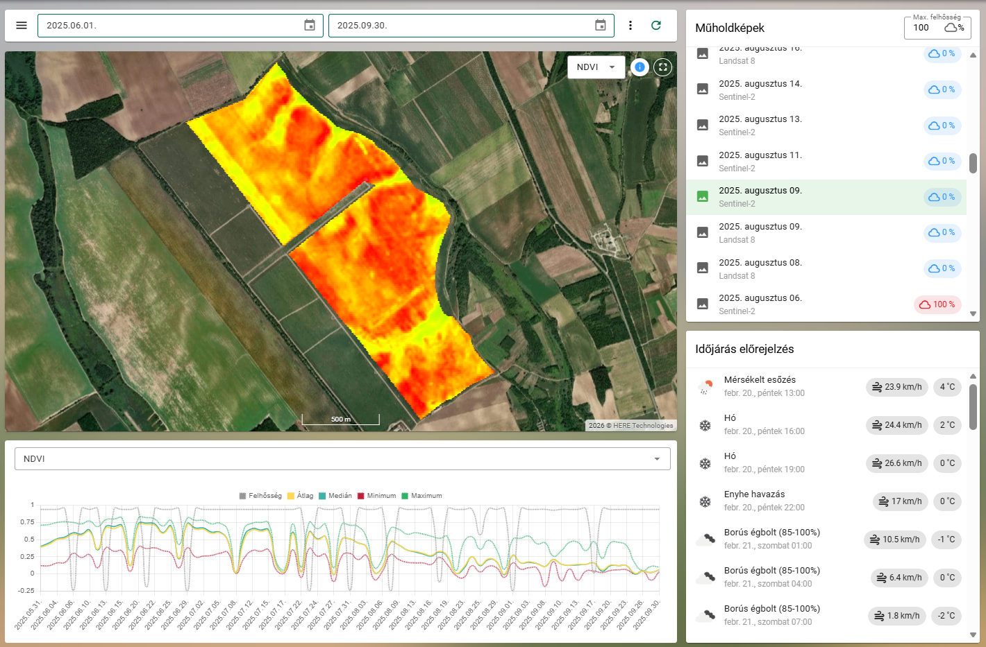 A harmadik pillér a Monitoring modul, amely folyamatos adatellátást biztosít az agronómiai döntésekhez. Aktuális időjárási adatokat biztosít, beleértve a talajhőmérsékletet és nedvességet, valamint 5 napos időjárás előrejelzést. Ezenkívül műholdas távérzékelésből származó adatokat is megjelenít, például a növényállomány vegetációs aktivitását (NDVI) és az aktuális vízellátottságát (NDWI). Az így kapott információk alapján a gazda adatokra alapozva tud helyes döntést hozni a legfontosabb kérdésekben, például elég meleg-e már a talaj a vetéshez, vagy van-e kiugró értéket mutató terület a táblán belül, ami gyomosodásra, esetleg károsítók megjelenésére utalhat.