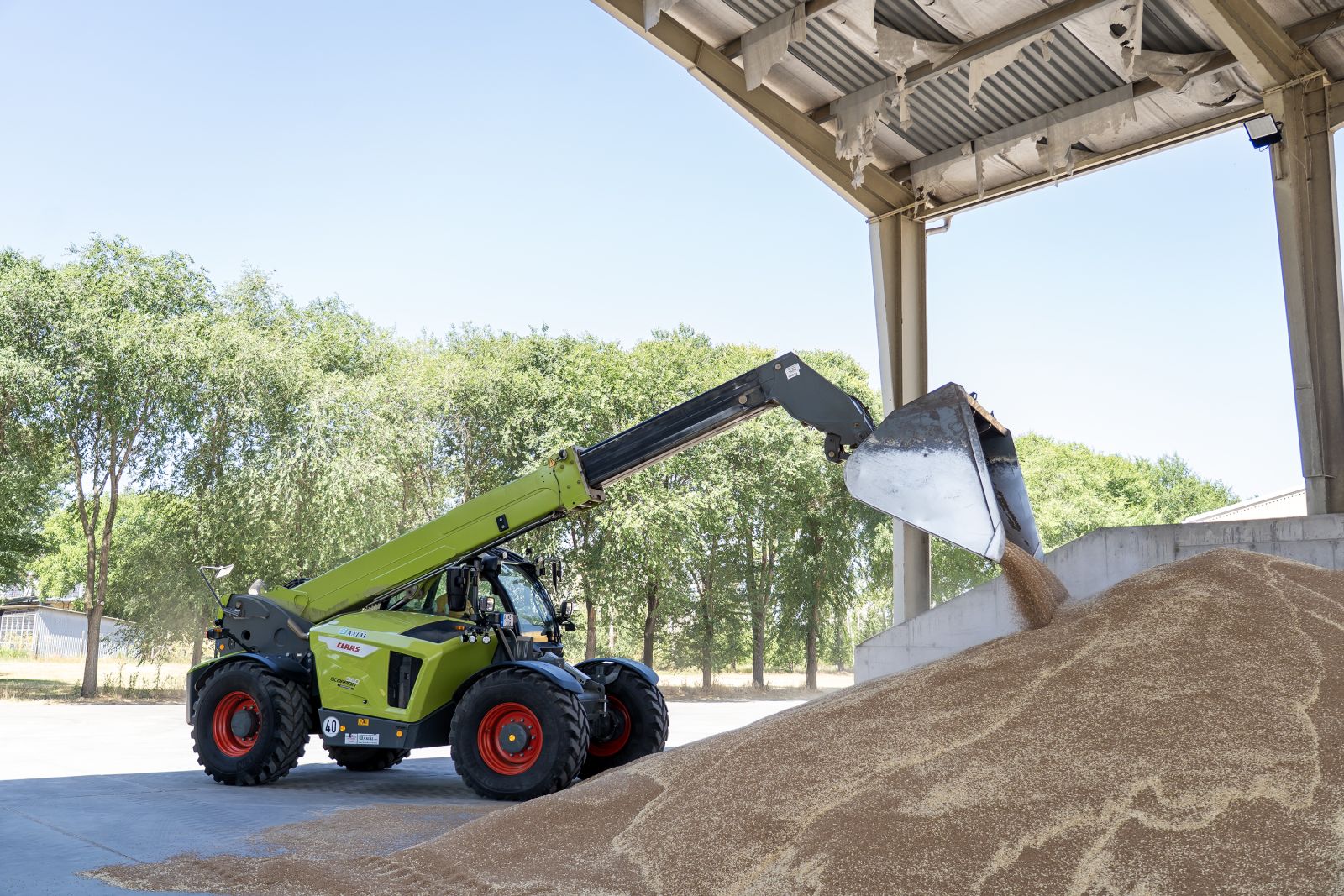 A gép kitolható teleszkópos gémjének emelési magassága megközelíti a 9 métert, maximális teherbírása pedig 6 tonna – ezeknek a tulajdonságoknak köszönhetően kiválóan alkalmas a termelési folyamatok logisztikai feladatainak ellátására. Számos munkaeszköz áll rendelkezésre a géphez, azonban leggyakrabban a 4,3 m3 ömlesztett anyag egyidejű mozgatására alkalmas kanál és a raklapvilla van használatban a Hód-Mezőgazdánál. Mi több, emelőkosár is rendelkezésre áll, amit leginkább a gazdaságban felmerülő karbantartási és magaslati munkálatok során alkalmaznak. Attila szerint a VARIPOWER PLUS fokozatmentes, hidrosztatikus hajtóműnek köszönhetően a SCORPION 960 három sebességtartományban használható, melyekre csiga-, teknősés nyúltartományként hivatkozik. Míg a csiga 0–17 km/h-ig, a teknős 17–34 km/h között, a nyúl pedig 34 km/h-tól egészen 45km/h-ig sebesség felett alkalmazandó. Mint említi, a nyúl módot leggyakrabban vonuláskor használják, míg a két alacsonyabb sebességfokozatot a rakomány súlyától függően választják: nehezebb rakománynál kisebb sebességgel, míg könnyebb rakomány esetén a közepes sebességkategóriával dolgoznak. A CLAAS rakodógépének 4 hengeres, 156 LE teljesítményű motorja DOC/DPF katalizátorral van felszerelve, teljesítménye tökéletesen megfelel a legváltozatosabb rakodási és logisztikai munkák elvégzéséhez; legyen szó takarmány vagy beérkező áru pakolásáról, a SCORPION mindig megbízható teljesítményt nyújt – emelte ki a gépkezelő.