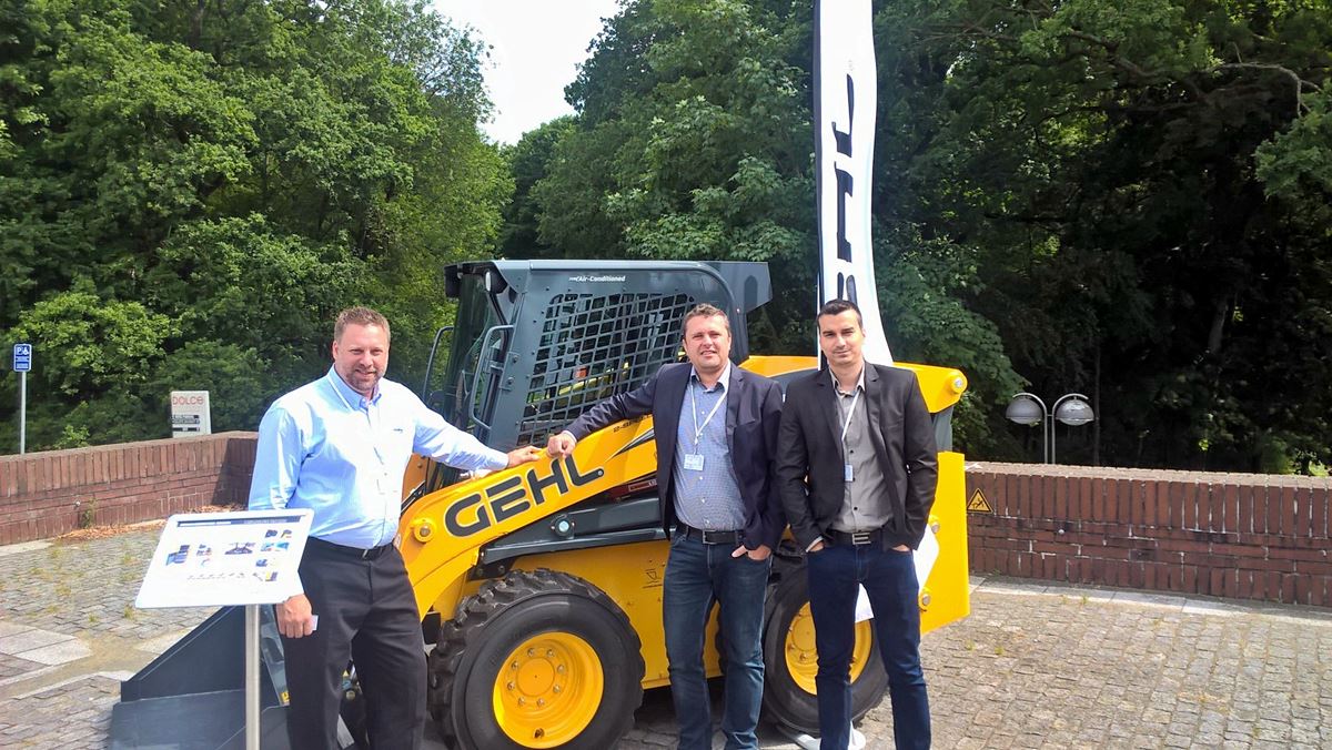 A képen: A Gehl csúszókormányzású széria vezető fejlesztőmérnöke, Brian Rabe (bal oldalon), illetve középen Peter Poliak, a Mannet termékmenedzsere, szlovák Gehl dealer, valamint Rózsás László az AXIÁL Kft. termékmenedzser